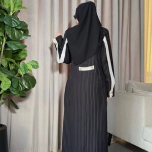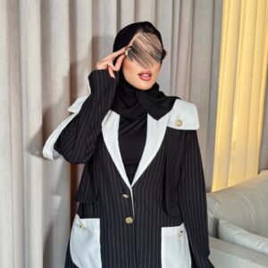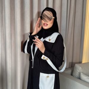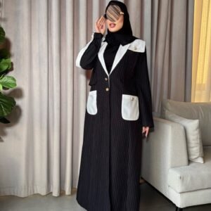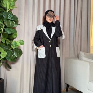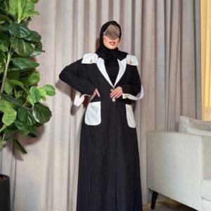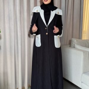 قصة العباية مستوحاة من البدلات الكلاسيكية بخطوط طولية رفيعة تمنح القوام طولًا وأناقة متناسقة، مع لمسات بيضاء على الياقة والأكمام والجيوب تضيف تباينًا جذابًا يعكس الثقة والرقي.