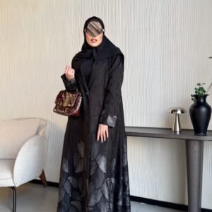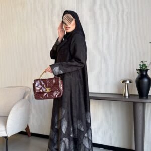 تتميز بخامة فاخرة بنقشة أوراق ناعمة تمنحها بعدًا فنيًا راقيًا، مع قصة انسيابية تعكس فخامة التصميم وتمنح القوام حضورًا أنثويًا متوازنًا.